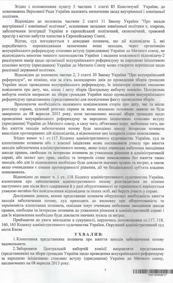 The Court also prohibited the Central Election Commission to send a representative to the meeting of citizens of Ukraine devoted to the referendum under the public initiative on Ukraine’s accession to the Customs Union, scheduled for September 8, 2013.
