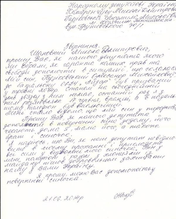 “A week ago the mother of the soldier, who fights in the battalion “Aydar” asked me for help. She asked to find her son Oleksander Hadzikovsky, who was captured by terrorists. In her letter, she wrote that she had heard the voice of her son on May 17 last time. Searches were difficult but thankfully successful. Just today Oleksander Hadzikovsky was exchanged for a Russian citizen. Another life is saved”, – wrote Mykola Katerynchuk.