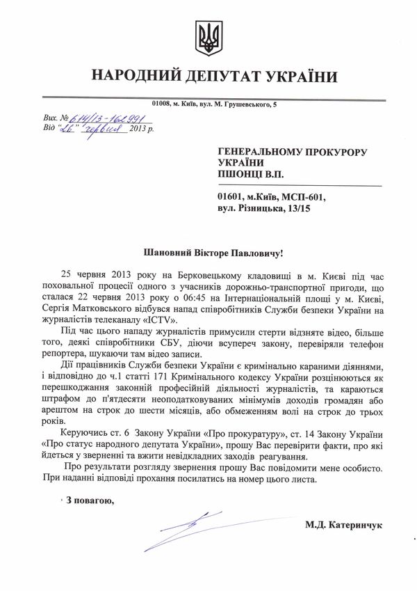 People’s Deputy of Ukraine, the leader of the European Party of Ukraine Mykola Katerynchuk sent an appeal to the Prosecutor General`s Office of Ukraine, in which he asks to find responsible for obstructing the journalists of the “Nadzvychayni Novyny” program during the funeral of the representative of the Security Service of Ukraine deceased in the resonant accident.