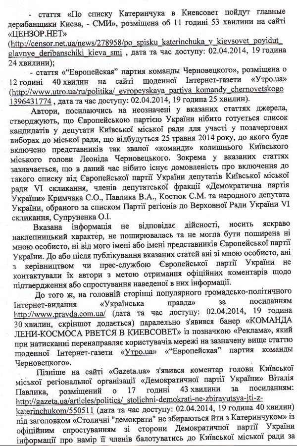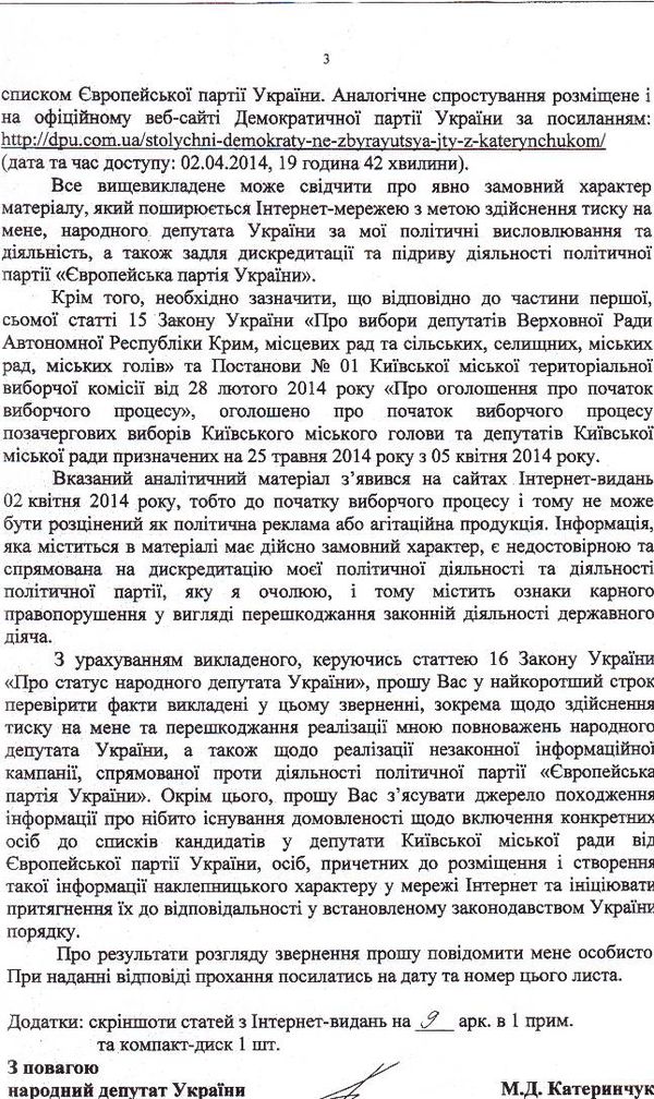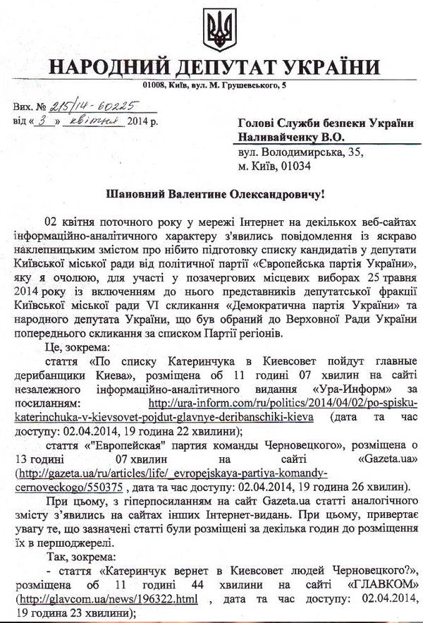 In addition, the People`s Deputy of Ukraine asked to find out the source of the information about the alleged existence of an agreement on the inclusion of individuals to the candidate lists for Kyiv City Council from the European Party of Ukraine and the people involved in the creation and placing of such defamatory information on the Internet, to initiate proceedings against them and to subject them to liability established by the legislation of Ukraine.