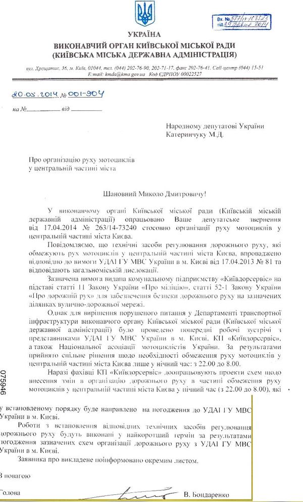 “The European Party of Ukraine got a permission for motorcyclists to enter the center of Kyiv”, – wrote the member of the European Party of Ukraine Oleksandr Poltavtsev on his page on Facebook. – “The motorcyclists are allowed to enter the center of Kyiv from 8 am to 10 pm. We received such response from the KCSA on May 29, 2014. Although the letter only partially meets the wishes of motorcyclists, which, in fact, we were referring to during the preparation of the relevant request, but still, it is the first victory”.