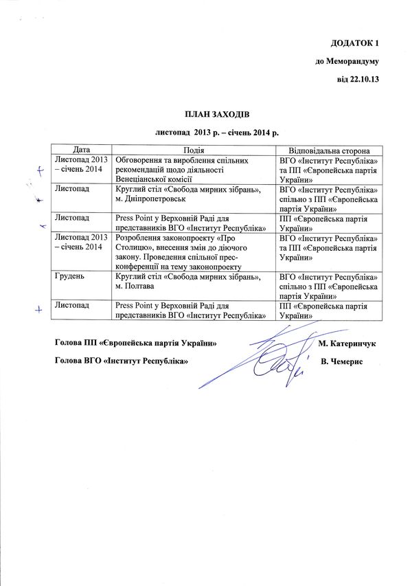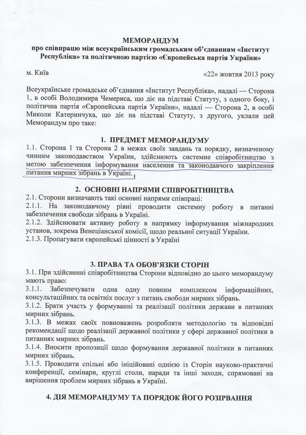 The signatories agreed to conduct at the legislative level systematic work on the issue of assembly freedom in Ukraine, to actively inform international institutions, including the Venice Commission, about the real situation in Ukraine and to promote European values.
