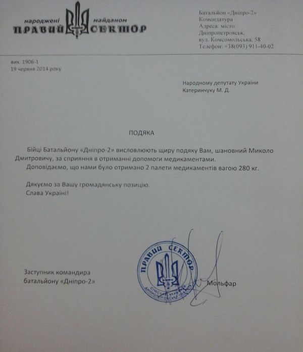 The soldiers of the battalion “Dnipro-2” thanked Mykola Katerynchuk for assistance in obtaining medicines. As it was previously reported, the European Party of Ukraine sent to the east of Ukraine over two hundred kilograms of medicines for Ukrainian soldiers, who are involved in the anti-terrorist operations. These are medicines that are left after folding of the European Party tent camp at Maidan in Kyiv.