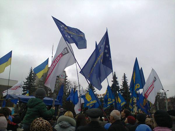 Около двух тысяч человек собрались 24 ноября в центре Луцка на митинг в поддержку подписания Украиной соглашения об ассоциации с Евросоюзом. Толпа митингующих была усеяна различными партийными флагами, среди которых развевались и флаги Европейской партии Украины.