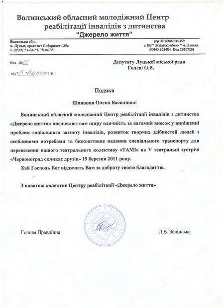 Після приїзду до рідного Луцька голова Центру реабілітації «Джерело життя» Людмила Зелінська висловила свою подяку наступними словами: «Нашому театральному колективу непросто виїжджати з виступами, адже учасники – молоді люди з обмеженими можливостями, частина акторів на інвалідних візках. У Червоноград теж було б потрапити складно, якби не допомога депутата Луцької міської ради Голєвої Олени Василівни. Щира подяка їй за допомогу, чуйність та розуміння. Наша маленька перемога присвячується цій чарівній жінці. Адже саме вона потурбувалась і надала безкоштовно автобус із підіймачем, який щойно придбали за сприяння Європейської партії України для перевезень по місту. Нам було дуже приємно їхати у ньому першими. Надіємось, і нашим лучанам автобус теж сподобається».