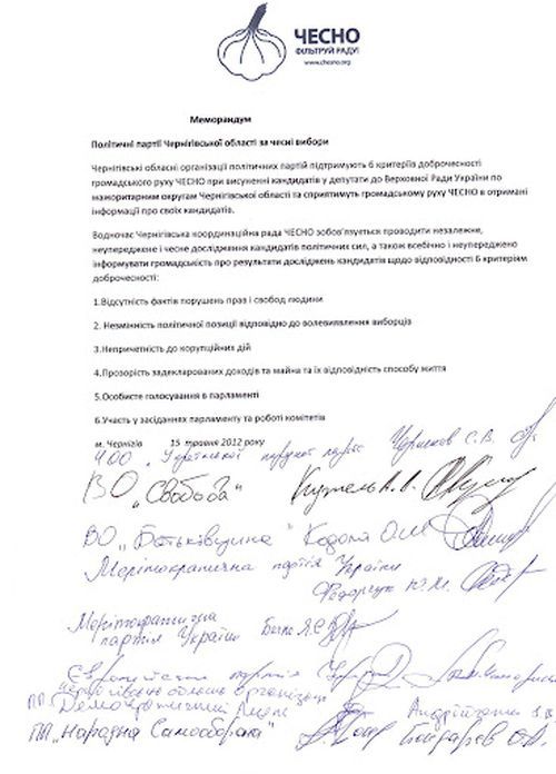 Черниговский координационный совет «ЧЕСТНО» обязался проводить независимое, беспристрастное и честное исследование кандидатов политических сил, а также всесторонне и беспристрастно информировать общественность о результатах исследований кандидатов на соответствие 6 критериям добродетели: