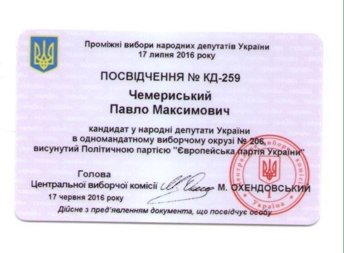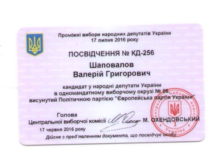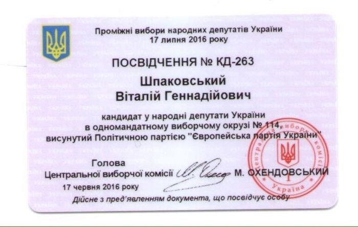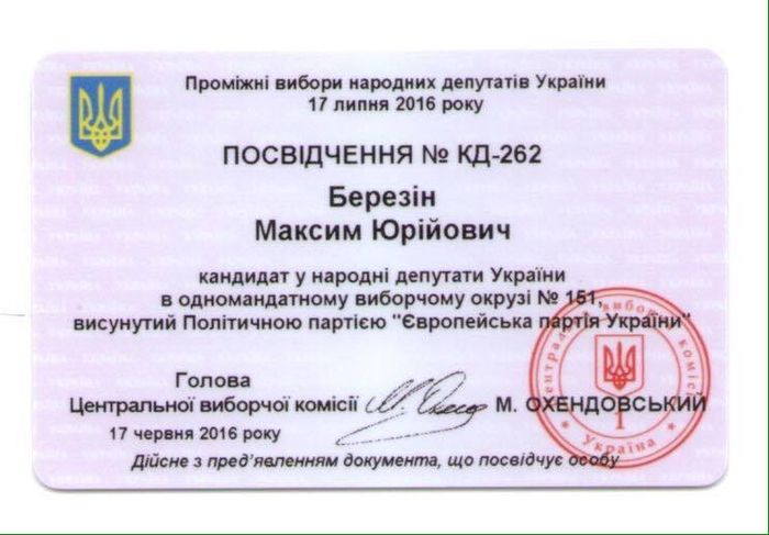 Центральная избирательная комиссия зарегистрировала кандидатов в народные депутаты от Европейской партии Украины. Соответствующие удостоверения получили четыре члена партии: Березин Максим Юрьевич (151-ый округ), Шаповалов Валерий Григорьевич (85-ый округ), Чемериский Павел Максимович (206-ой округ), Шпаковский Виталий Геннадьевич (114-ый округ).