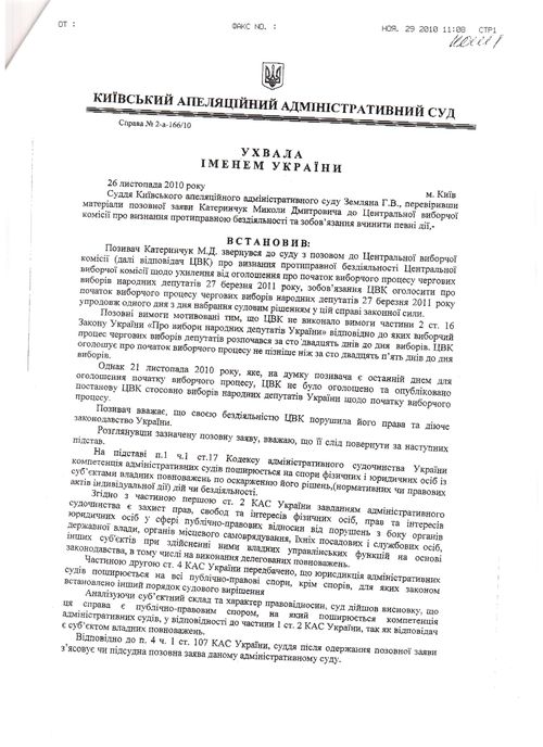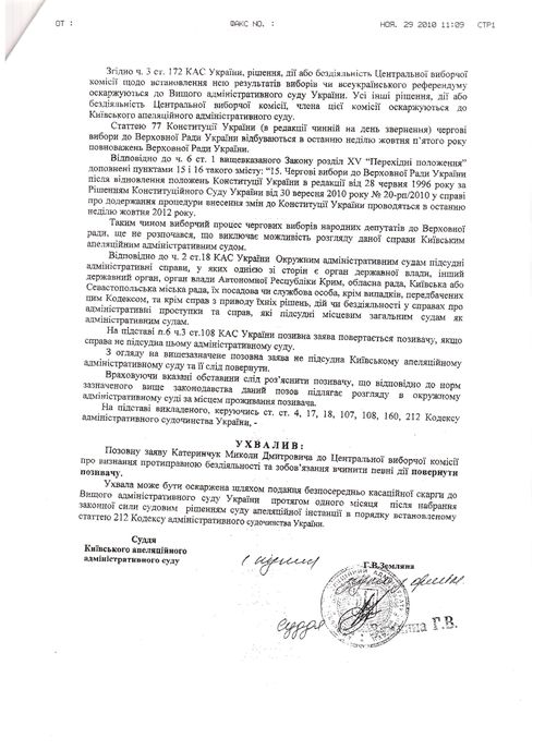 Як повідомлялося раніше, 24 листопада 2010 року Окружний адміністративний суд Києва повернув Миколі Катеринчуку заяву, в якій він просив суд визнати протиправною бездіяльність Центральної виборчої комісії щодо ухилення від оголошення про початок виборчого процесу чергових виборів народних депутатів 27 березня 2011 року та змусити ЦВК оголосити про початок виборчого процесу. Рішення Київського апеляційного адміністративного суду на відповідну апеляційну скаргу очікується.