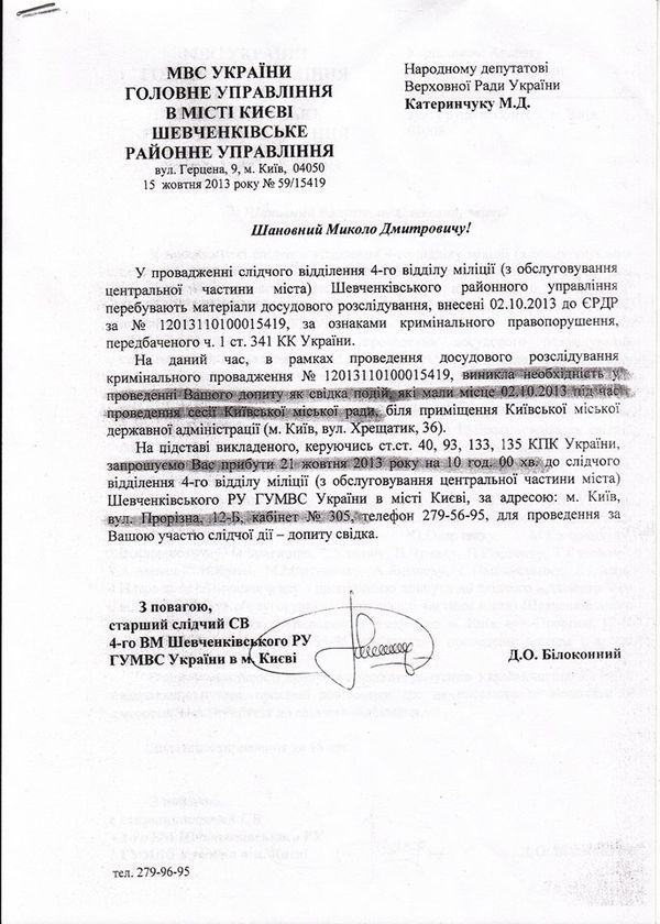 «2 жовтня я вчинив як громадянин своєї країни. І якщо треба буде це повторити – повторю», – написав народний депутат України, лідер Європейської партії України, член парламентської фракції «Батьківщина» Микола Катеринчук на своїй сторінці у Фейсбук. Він повідомив, що отримав від правоохоронних органів виклик на допит у якості свідка подій, які мали місце 2 жовтня 2013 під час проведення сесії Київської міської ради, біля приміщення Київської міської державної адміністрації.