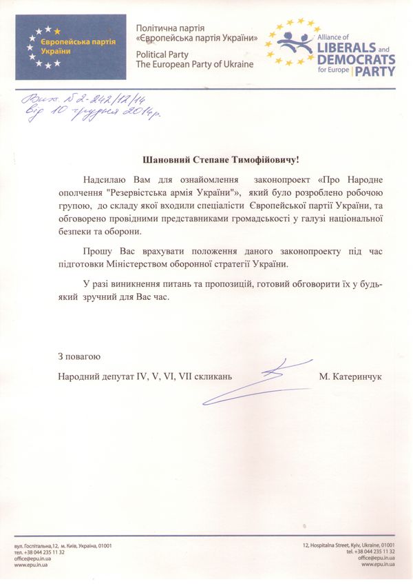 Зокрема Микола Катеринчук направив листи Міністру оборони України та Міністру регіонального розвитку, будівництва та житлово-комунального господарства України. Політик пропонує врахувати підготовлені законопроекти «Про народне ополчення «Резервістська армія України» та законопроект «Про товариство співвласників будинку».
