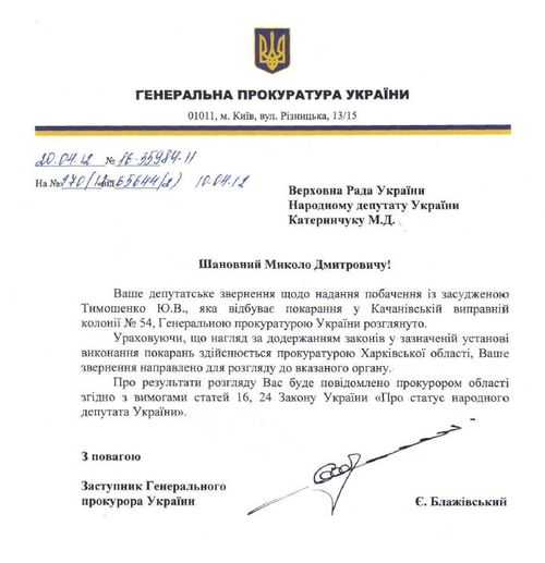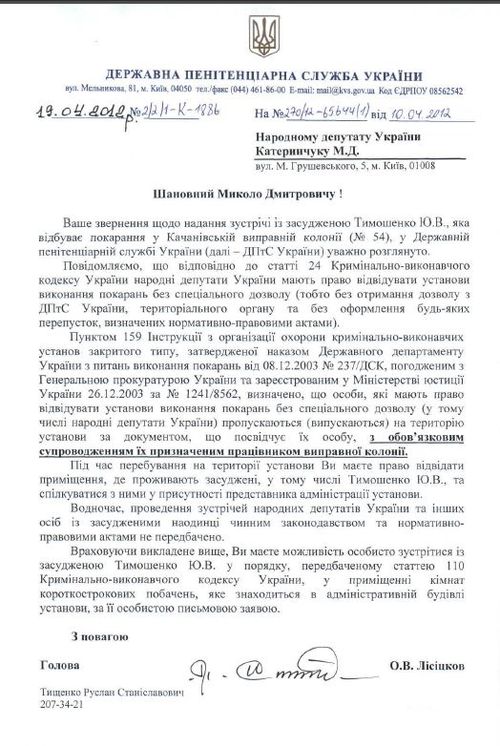 Як повідомлялося раніше Микола Катеринчук надіслав звернення до Генерального прокурора України та до голови Державної пенітенціарної служби з проханням дозволити особисту зустріч із Юлією Тимошенко.