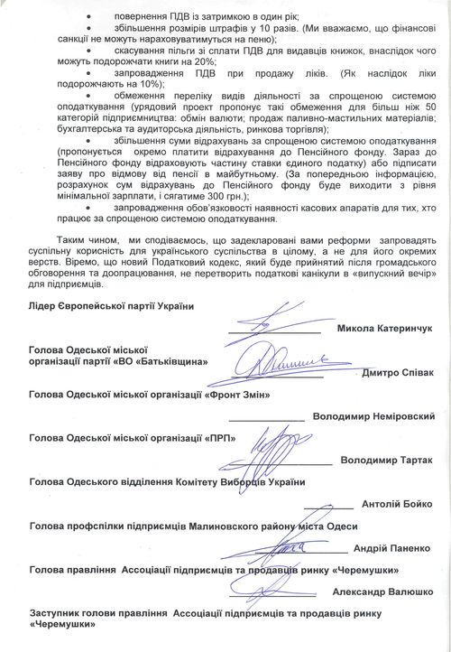 «Запропоновані новації важко і, навіть, неможливо назвати такими, які бодай би на йоту покращували умови для розвитку підприємництва в Україні. Більше того, вони суттєво обмежать роботу в рамках чинного законодавства, як приватного, так і державного сектору економіки. Вважаємо своїм громадянським обов’язком висловити рішучий протест проти можливого ухвалення нових правил відносин між податківцями та підприємцями і закликаємо вас вдатися до суттєвого доопрацювання документу з урахуванням пропозицій та зауважень провідних фахівців країни у галузі оподаткування, підприємців та громадськості. Пропонуємо перенести розгляд проекту Податкового кодексу на осінь цього року, аби мати можливість кардинально його доопрацювати і найголовніше, виважено підійти до створення справді прозорих правил на ринку оподаткування, котрі не йтимуть у розріз з інтересами підприємців, держави і відповідатимуть цивілізованим європейським стандартам», – мовиться у зверненні.