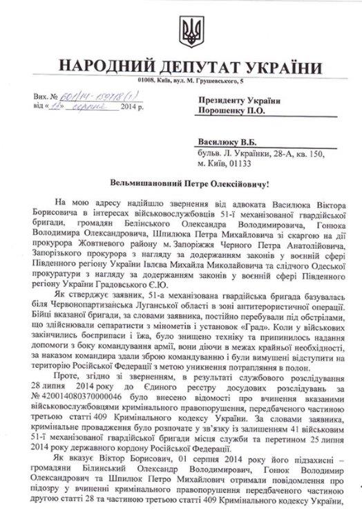 За словами заявника, прокуратура Запоріжжя безпідставно звинувачує військових 51-ї механізованої гвардійської бригади, не маючи доказів їх вини у скоєнні злочину, передбаченого статтею 409 Кримінального кодексу України, свідомо ігнорує факт того, що військовослужбовці виконували наказ командира здати зброю і рятувати своє життя після двотижневого обстрілу та залишення вищим керівництвом їх без боєприпасів, їжі та води, навмисно намагається надати діям бійців тяжкості шляхом звинувачення їх у вчиненні злочину «групою осіб», що як кваліфікуюча ознака не передбачена статтею 409 Кримінального кодексу України, а також затягує процес розслідування у вказаному кримінальному провадженні шляхом подачі апеляцій на законні рішення суду першої інстанції.