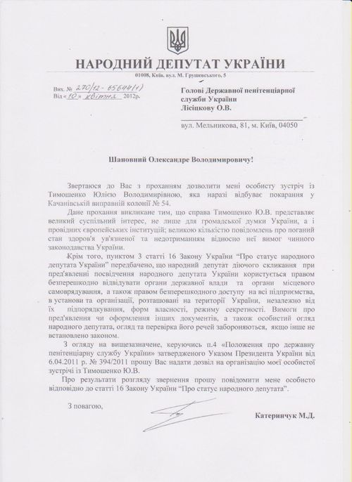 Лідер Європейської партії України, народний депутат України Микола Катеринчук надіслав звернення до Генерального прокурора України та до голови Державної пенітенціарної служби з проханням дозволити особисту зустріч із Юлією Тимошенко.