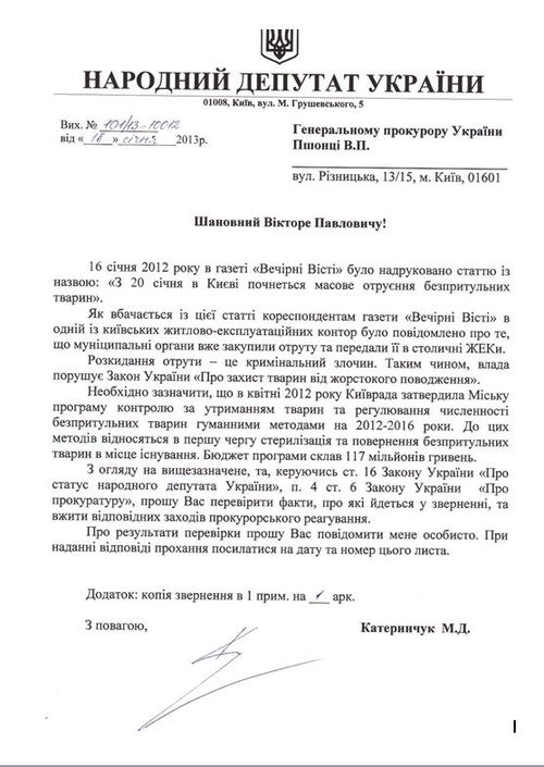 «16 січня 2012 року в газеті «Вечірні Вісті» було надруковано статтю із назвою: «З 20 січня в Києві почнеться масове отруєння безпритульних тварин». Як вбачається із цієї статті кореспондентам газети «Вечірні Вісті» в одній із київських житлово-експлуатаційних контор було повідомлено про те, що муніципальні органи вже закупили отруту та передали її в столичні ЖЕКи. Розкидання отрути – це кримінальний злочин. Таким чином, влада порушує Закон України «Про захист тварин від жорстокого поводження», – йдеться у запиті.