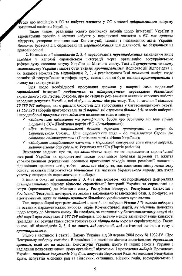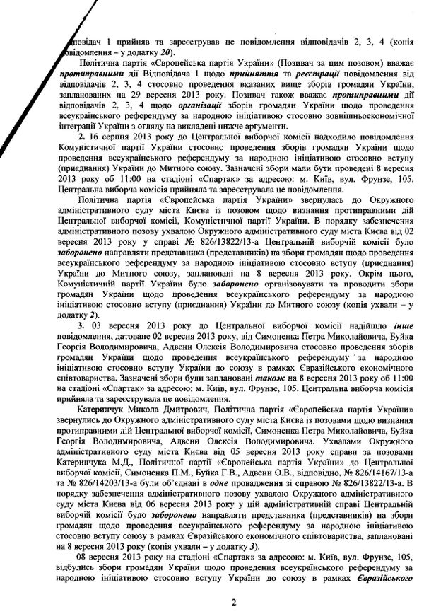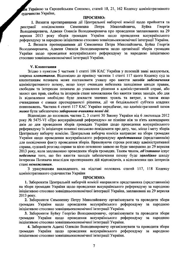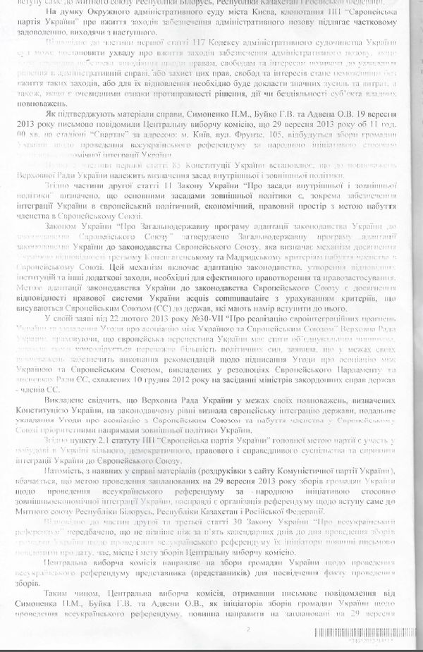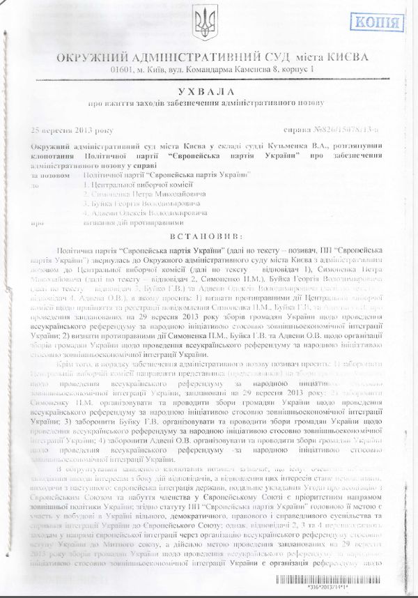 “Заборонити Центральній виборчій комісії направляти представника (представників) на збори громадян щодо проведення всеукраїнського референдуму за народною ініціативою стосовно зовнішньоекономічної інтеграції України, заплановані на 29 вересня 2013 року”, – йдеться в ухвалі суду.