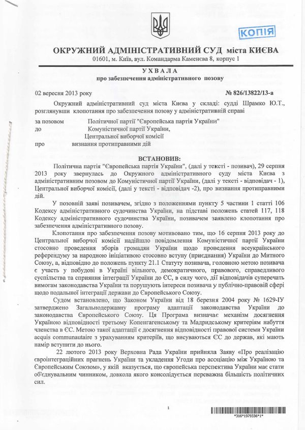 Як повідомлялося, 29 серпня 2013 року Європейська партія України, яку очолює народний депутат України, член парламентської фракції “Батьківщина” Микола Катеринчук, зареєструвала в Окружному адміністративному суді міста Києва позовну заяву, в якій просила заборонити Комуністичній партії України організовувати та проводити збори громадян України щодо проведення всеукраїнського референдуму за народною ініціативою стосовно вступу (приєднання) України до Митного союзу.