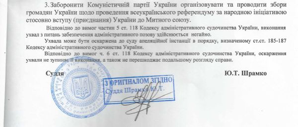 Окружний адміністративний суд міста Києва заборонив Комуністичній партії України організовувати та проводити збори громадян України щодо проведення всеукраїнського референдуму за народною ініціативою стосовно вступу (приєднання) України до Митного союзу. Відповідну ухвалу про забезпечення адміністративного позову Європейської партії України до КПУ сьогодні будо оголошено у судовому засіданні Окружного адмінсуду.