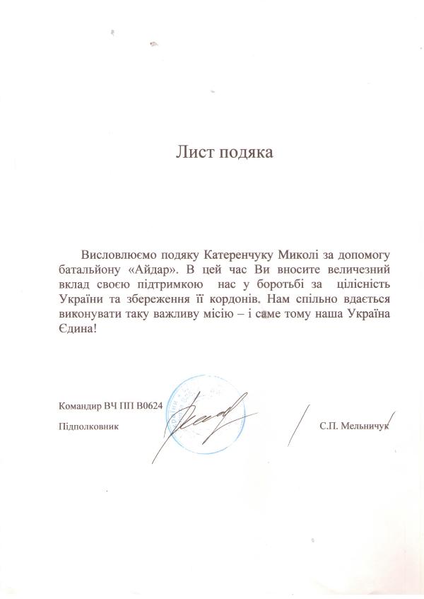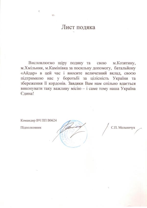 – Доставка гуманітарки в Щасливе коштує більше, ніж сам вантаж. Усе це можна було купити у Харкові. Але для мене принципово було привезти допомогу від жителів саме в зону АТО. І подяка за підписом командира батальйону «Айдар» Сергія Мельничука мешканцям Калинівського, Козятинського та Хмільницького районів сьогодні коштує набагато більше для тих, хто не залишається осторонь проблем.