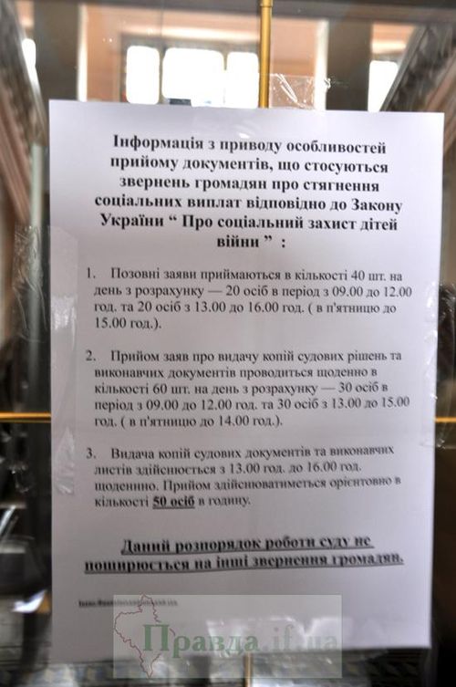 Тому цього разу дітей війни вирішили поставити в чергу, встановивши для них персональну кількісну квоту на денну норму зданих заяв до суду. Посилаючись на значне перевантаження судів, дітям війни дозволено в день здавати не більше 40-ка позовних заяв. Просто і зрозуміло! Такого ще не було ні за якої влади. Замість того, щоб покращити умови для людей похилого віку, як це робиться в цивілізованих державах, судові чиновники вирішили обмежити їх у праві безперешкодного звернення до суду за захистом своїх прав, грубо порушивши при цьому конституційну норму про безперешкодне звернення до суду. Тепер діти війни вимушені записуватись в чергу, щоб звернутись до суду та чекати своєї «квоти».