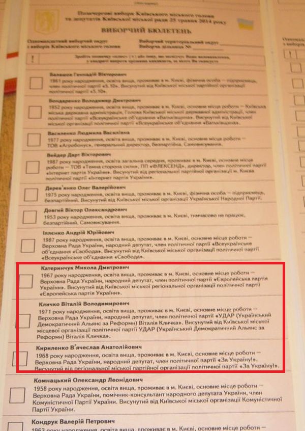 Територіальна виборча комісія міста Києва сьогодні серед інших презентувала на своєму засіданні сигнальний номер виборчого бюлетеню кандидатів на посаду столичного голови. Відповідно до чинного законодавства усі кандидати розташовуються у бюлетені в алфавітному порядку. Однак ймовірно через незнання української абетки після кандидата на посаду Київського міського голови від Європейської партії України Миколи Катеринчука надруковане прізвище Кличка замість В’ячеслава Кириленка.