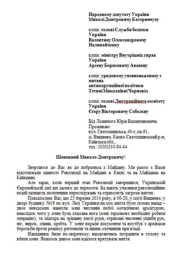 В повідомлення зазначається, що на нього 25 березня 2014 року у місті Вишневе було скоєно напад, в результаті чого він отримав чисельні тілесні ушкодження. Двоє невідомих нанесли побої металевою арматурою, внаслідок чого була зламана нога, потрощено кисть руки, отримані численні забої рук, ніг, нирок, спини, хребта. Також у нього вкрадено документи та ноутбук з архівами боротьби «проти режиму регіоналів та інших злочинців при владі».