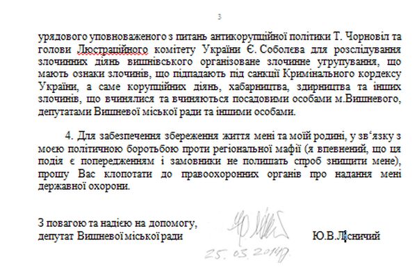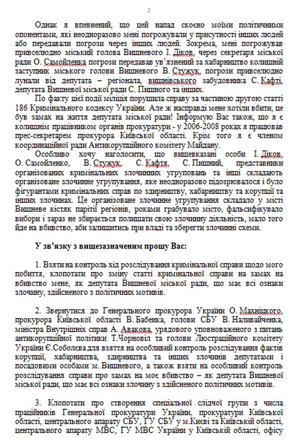 «Нападники били по-звірячому, намагаючись потрапити в голову та вбити мене. Якимось дивом мені вдалося врятувати життя», – йдеться в заяві. – «Однак я впевнений, що цей напад скоєно моїми політичними опонентами, які неодноразово мені погрожували у присутності інших людей або передавали погрози через інших людей. Зокрема, мені погрожував привселюдно міський голова Вишневого І. Діков, через секретаря міської ради О. Самойленка погрози передавав ув’язнений за хабарництво колишній заступник міського голови Вишневого В. Стужук, погрози привселюдно лунали від депутата – регіонала, вишнівського забудовника С. Кафті, депутата Вишневої міської ради С. Пишного та інших».