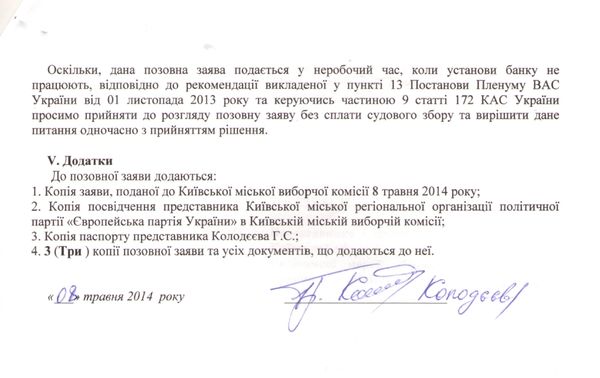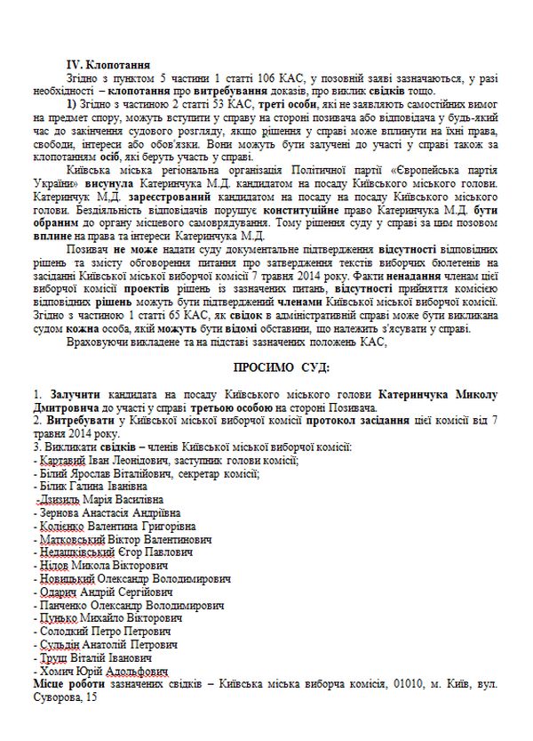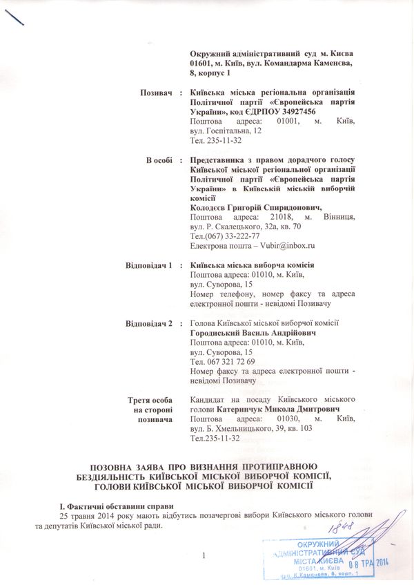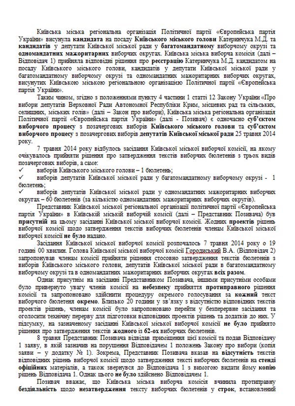 Європейська партія України сьогодні звернулася з позовною заявою(текст додається)  в Окружний адміністративний  cуд  Києва аби визнати протиправною бездіяльність Київської міської виборчої комісії щодо незатвердження у строк текстів виборчих бюлетенів виборів Київського міського голови, виборів депутатів Київської міської ради у багатомандатному виборчому окрузі та виборів депутатів Київської міської ради у одномандатних мажоритарних виборчих округах, а це всього 62 бюлетені.