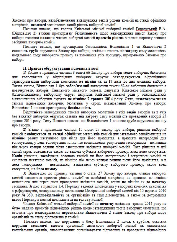 «Тому ми пропонуємо достроково припинити повноваження усього складу Київської міської виборчої комісії аби унеможливити в такий спосіб подальших порушень. Адже усі наші багаторазові зауваження щодо порушень роботи комісії залишилися незадоволеними. Ми вважаємо, що ця комісія саме в такому складі нездатна провести Київські вибори чесно та прозоро», – додав юрист.
