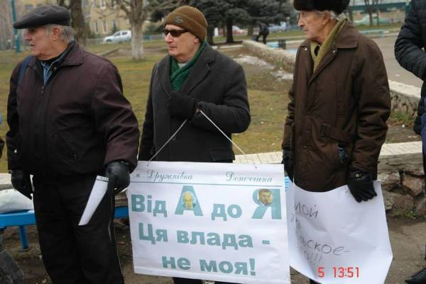 Майже в самому серці Дружківки в цей похмурий зимовий день зібралася і молодь, і старше покоління дружківчан, щоб засвідчити свій протест політиці теперішньої влади. При чому, випадкові перехожі ставилися до мітингу доволі приязно.