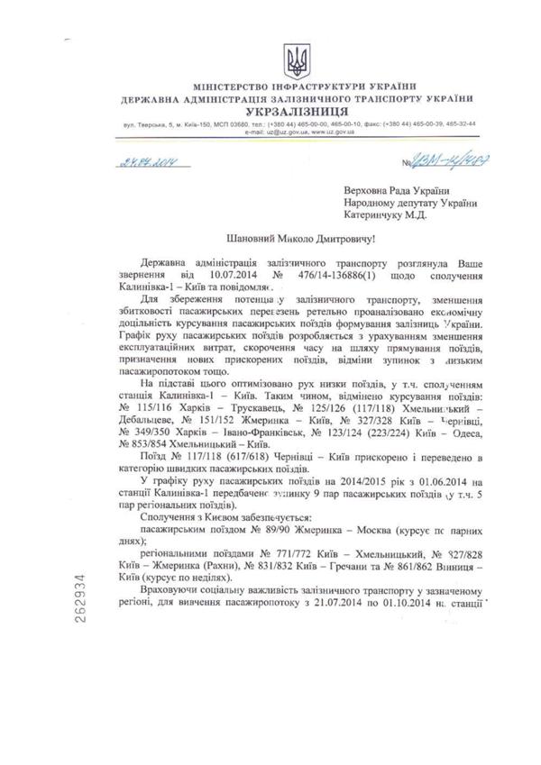 Як результат, після звернення Миколи Катеринчука до Укрзалізниці, за два тижні Державна адміністрація залізничного транспорту відновила зупинки додаткових потягів сполученням Калинівка – Київ.